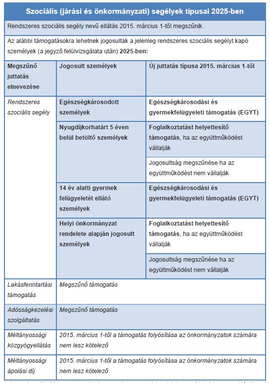 Az alábbi táblázatban foglaljuk össze azt, hogy a rendszeres szociális segély 2015. március 1-jével történő megszűnése után milyen jogcímen lehet 2025-ben támogatásokhoz jutni a járási hivataloktól, valamint a települési önkormányzatoktól, a jegyző döntése alapján.